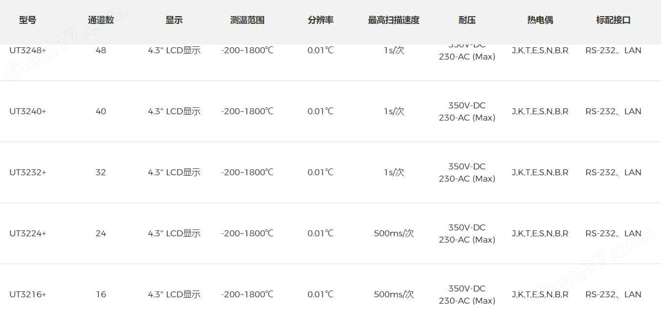 UT3200+系列多路温度测试仪,共有6款型号UT3208+/UT3216+/UT3224+/UT3232+/UT3240+/UT3248+,分别对应8、16、24、32、40、48通道,仪器4.3英寸液晶彩屏显示,界面美观,可同时对多路温度数据进行采集,上超下超报警和通讯传输,兼容多种温度传感器,响应速度快,数据稳定,同时具备断偶检测功能。